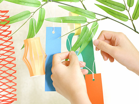 短冊に願いごとを書いて、笹の葉を飾りつけ。「たなばたさま」もみんなで歌います。