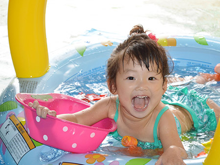 夏の暑さを吹き飛ばせ!園庭に大きなビニールプールを広げて、みんなでプール遊びをします。